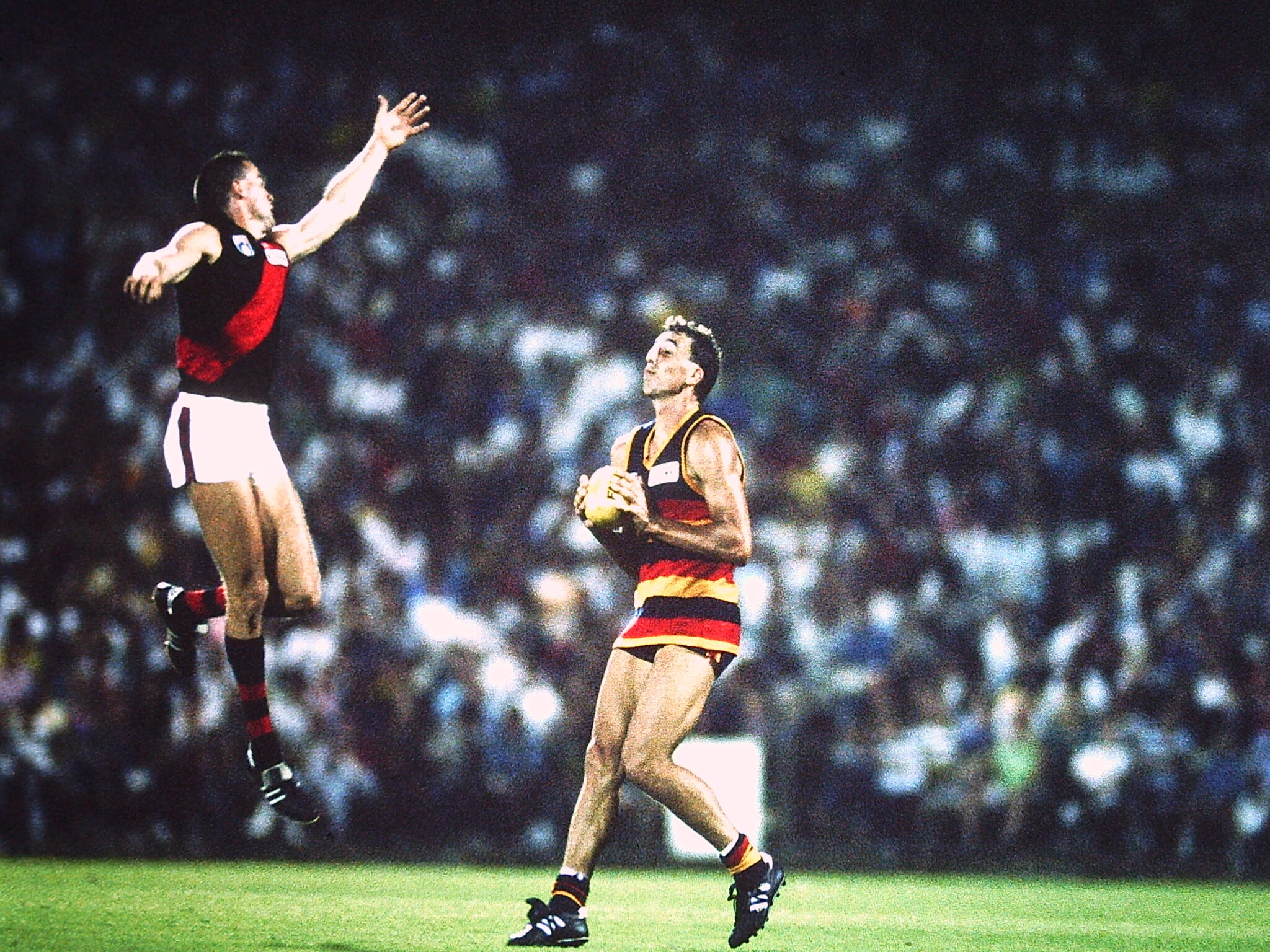 “HEROES” was the banner headline on the front page of the Sunday Mail, which produced a souvenir wrap-around to mark Adelaide’s 27-point win over 1990 grand finalists Essendon under lights at a packed Football Park.