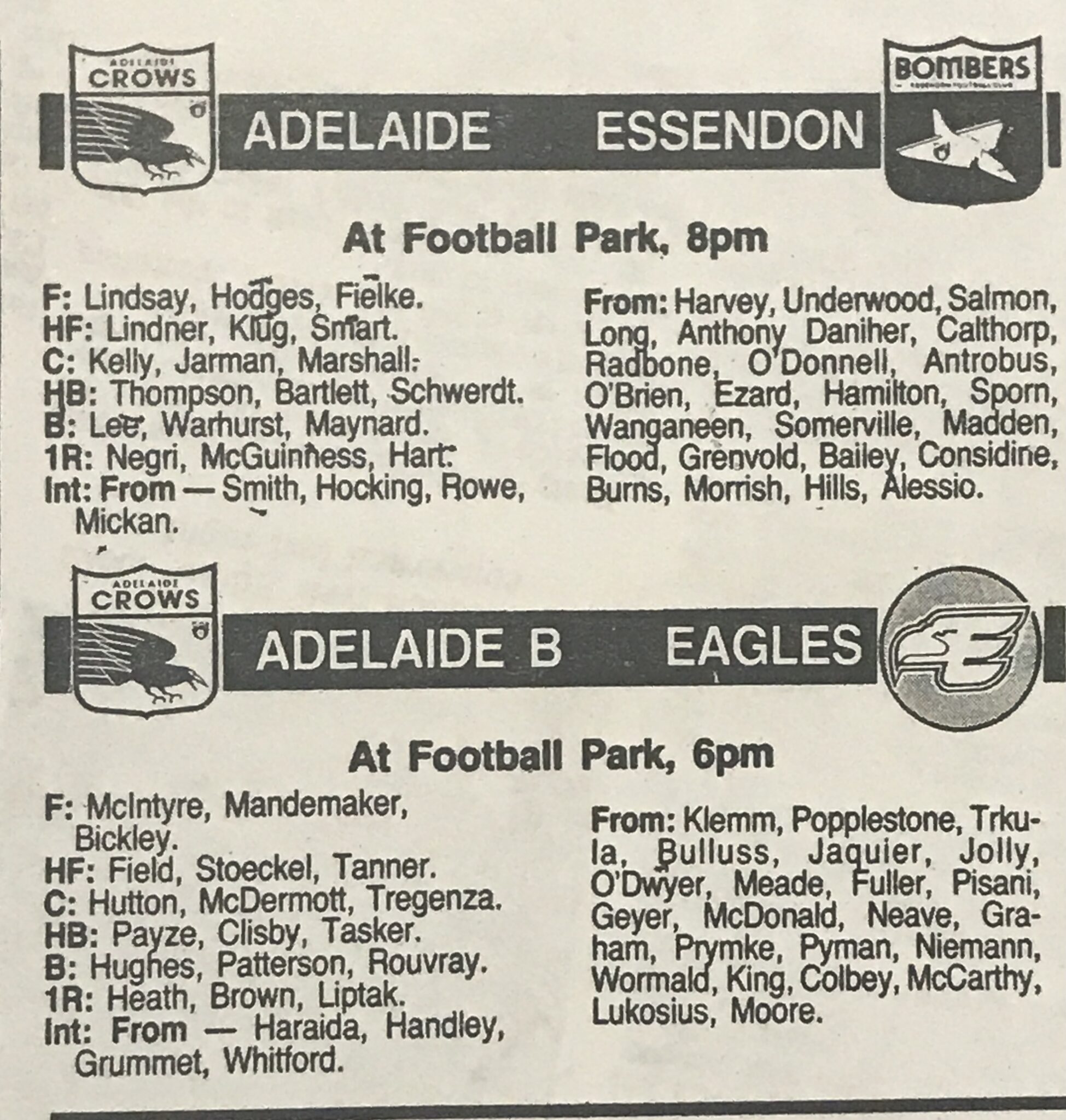 A Crows ‘B’ team – strengthened by the addition of soon-to-be-named captain Chris McDermott, Simon Tregenza and Danny Hughes – thrashed new amalgamated SANFL club Woodville-West Torrens by 63 points in the first game.