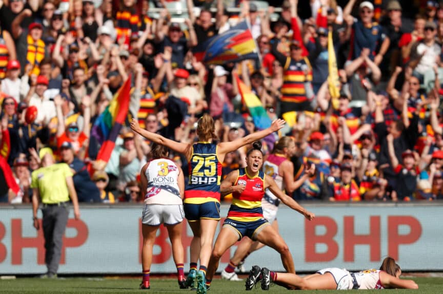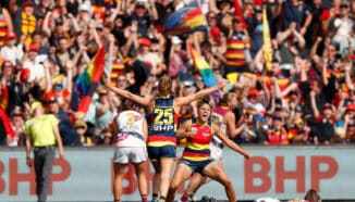 Thompson played every game in the first three years, as a defender the first two seasons, before moving into the forward line in the third. She starred in her first season as a forward, winning the League’s leading goalkicker award in 2019 after kicking 14 majors, and being named in the All-Australian side. Thompson featured in all three of Adelaide’s premierships and was awarded Life Membership in 2025.
