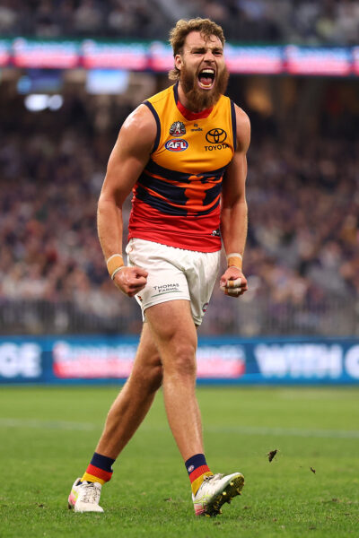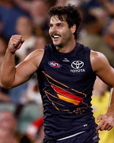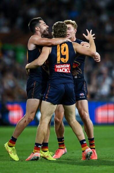 Patrick Dangerfield during Adelaide’s first home game at Adelaide Oval; the Adelaide Oval commemorative jumper patch; names on the back of the round five jumper.