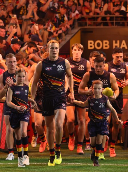 The front and back of the new gold-based Anzac jumper, as worn by Riley Thilthorpe. Darcy Fogarty, then Alex Neal-Bullen, Zac Taylor (19) and Sid Draper during Gather Round; Jordan Dawson leads the Crows out