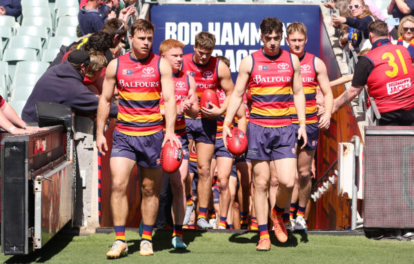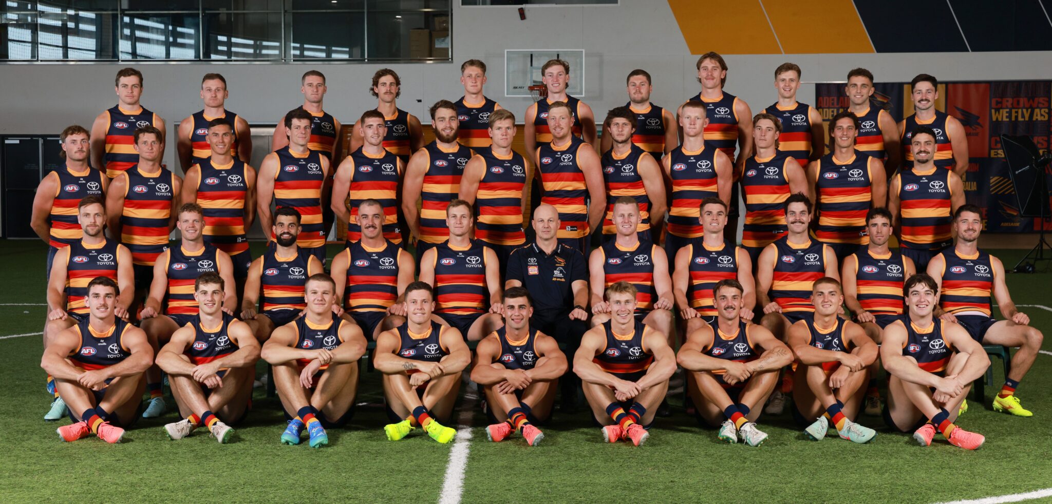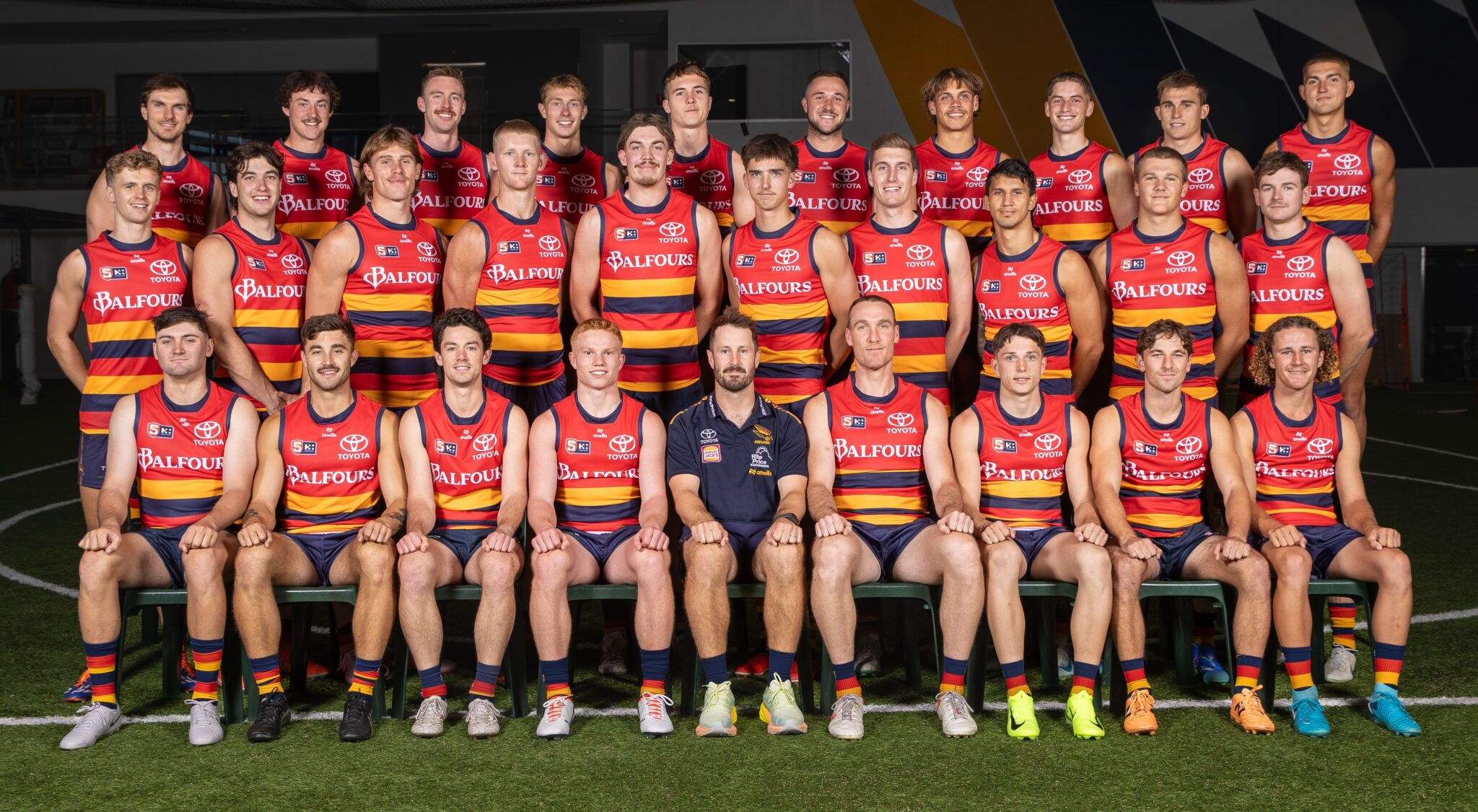 Back row (from left): Zac Taylor (19), Rory Laird (29), Sam Berry (3), James Peatling (25), Brayden Cook (15), Max Michalanney (16), Harry Schoenberg (26), Daniel Curtin (6), Karl Gallagher (36), Lachlan Sholl (38), Chayce Jones (1). Third row: Luke Pedlar (10), Matt Crouch (5), Isaac Cumming (44), Chris Burgess (21), Mark Keane (48), Riley Thilthorpe (7), Nick Murray (9), Kieran Strachan (45), Jordan Butts (41), Toby Murray (39), Josh Worrell (24), James Borlase (35), Izak Rankine (23). Second row: Brodie Smith (33), Mitch Hinge (20), Wayne Milera (30), Taylor Walker (13), Jordan Dawson (captain, 12), Matthew Nicks (senior coach), Reilly O’Brien (43), Ben Keays (2), Darcy Fogarty (32), Lachlan Murphy (4), Alex Neal-Bullen (28). Front row: Hugh Bond (40), Billy Dowling (31), Tyler Welsh (17,) Jake Soligo (14), Josh Rachele (8), Sid Draper (34), Luke Nankervis (27), Oscar Ryan (22), Charlie Edwards (11).