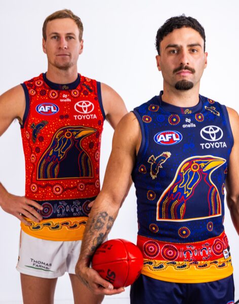 Jordan Dawson and Max Michalanney model the main guernsey; the red clash guernsey; Darcy Fogarty in Gather Round: Riley Thilthorpe in the Anzac Day jumper; Dawson and Izak Rankine show the two Indigenous designs