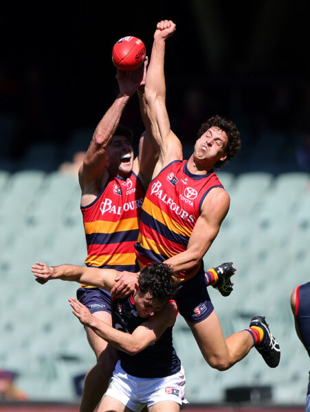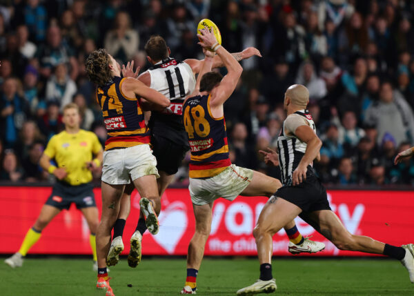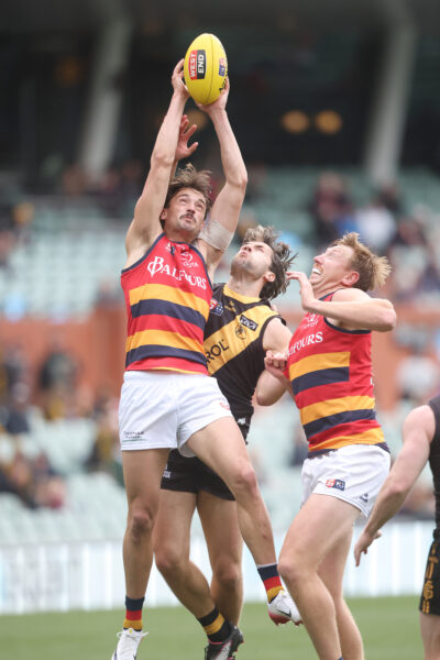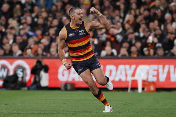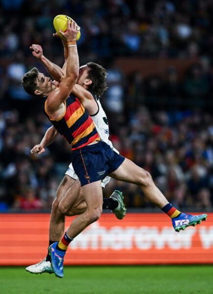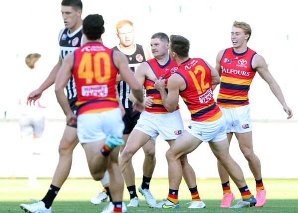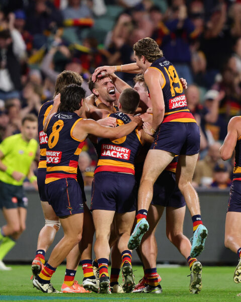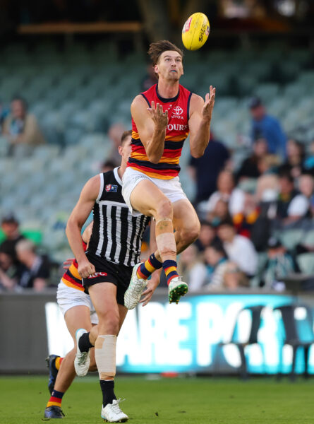 Dawson booted three goals to inspire Adelaide to a 60-point thrashing of Carlton in round eight at Adelaide Oval. Another Showdown thriller ended in a five-point win to Adelaide. Mark Keane took a courageous contested mark to deny a Port attack in the last minute. Thilthorpe was an immense aerial presence, grabbing ten marks.