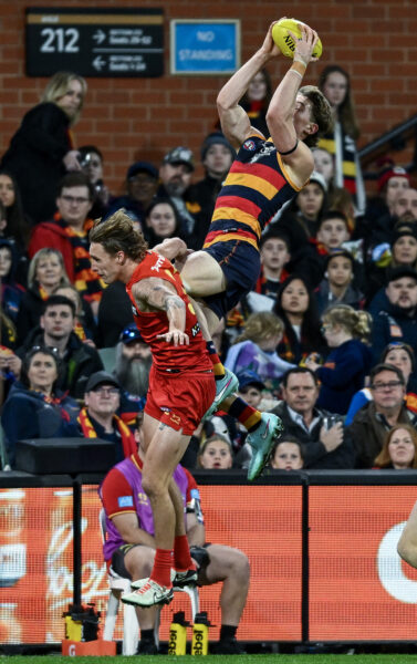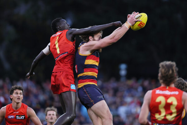 But Adelaide’s bid for a fourth consecutive win fell frustratingly short on the Gold Coast. With just over a minute remaining and the Crows trailing by a point, Rankine appeared to have a good piece of a chest mark in the forward pocket before he was tackled, the ball was jolted free and the umpires called play-on. Thilthorpe was magnificent, the game’s best player with five goals.