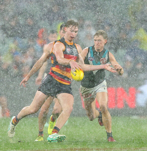 Adelaide demolished Port in the rain by a record Showdown margin of 98 points,with Thilthorpe booting three goals to secure his first Showdown Medal.